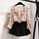 春夏新款韩版时尚荷叶边上衣碎花衬衫女抽绳喇叭袖v领套头雪纺衫