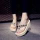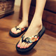 韩版波西米亚手工人字拖水钻高跟凉拖鞋女夏坡跟厚底防滑沙滩鞋拖