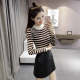 长袖t恤女秋冬新款韩条纹套头毛衣女V领针织打底衫上衣外穿秋衣服