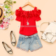 夏季新款花朵一字领套头蕾丝衫短袖女喇叭袖露肩上衣打底小衫女装