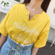 ZC 韩版小V领口珍珠装饰设计感字母刺绣纯色T恤半袖女夏