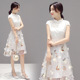 2017夏装新款韩版修身高腰连衣裙立领蕾丝欧根纱拼接旗袍中裙