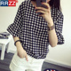 学生2015秋季新款韩版修身显瘦打底衬衣中长款格子长袖衬衫女夏
