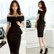春夏新款时尚韩版名媛女装显瘦拼接高腰一字领露肩性感包臀连衣裙