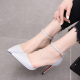 2017春新款银色浅口尖头中空单鞋一字扣细跟高跟鞋OL气质宴会女鞋
