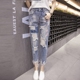 春夏韩版刺绣乞丐裤2017毛边破洞牛仔裤女九分裤宽松显瘦哈伦裤潮