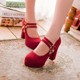 2015新款春秋大码女鞋扣带磨砂圆头浅口粗跟单鞋女高跟鞋红色婚鞋