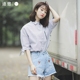 迪悠新款条纹休闲宽松衬衫女短袖百搭学生上衣修身韩版半开领潮