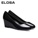真皮坡跟工作鞋女黑色圆头浅口通勤单鞋职业女鞋百搭舒适中跟鞋子