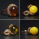 蜜蜡可调节戒指玫瑰金镶嵌鸡油黄老蜜蜡金珀蓝血珀琥珀珠指环女款