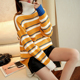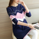 秋冬新款韩版女装中长款宽松甜美拼色波浪纹圆领套头毛衣外套