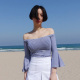 韩国代购夏休闲海军风一字领露肩喇叭袖修身条纹上衣纯棉T恤1438