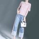 2017夏季女装新款甜美粉蕾丝衫卷边宽松直筒牛仔裤女夏时尚套装