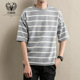 男士韩版潮流七分袖短袖t恤宽松个性圆领半截袖条纹中袖打底衫男