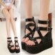 2017夏季欧美街头交叉带搭扣坡跟松糕厚底内增高罗马夹趾女凉鞋靴