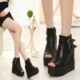 2017春季松糕坡跟高跟鱼嘴凉鞋12cm内增高单鞋镂空厚底防水台短靴
