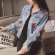 2016夏装韩版新款修身POLO领单排扣玫瑰绣花牛仔短外套女