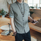 中国风夏季亚麻七分袖衬衫男士短袖盘扣复古修身棉麻刺绣花衬衣男