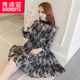 复古港味长袖气质蕾丝连衣裙超长款韩版a字裙碎花高腰修身裙子仙