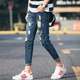春季男士牛仔九分裤男装9分小脚裤子青少年修身韩版破洞牛仔裤男