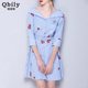 晴碧琳v领七分袖条纹衬衫裙连衣裙女夏 2017新款绣花宽松荷叶边裙