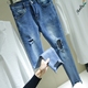 春季新款高腰弹力毛边九分裤深蓝色膝盖破洞牛仔铅笔裤子女D278