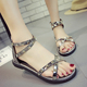 凉鞋女夏2017新款粗跟百搭中跟水钻性感防滑一字扣露趾女鞋大小码