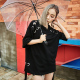 【天天特价】高街欧美朋克可拆卸排扣设计不规则下摆七分袖T恤女