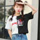 实拍 韩版转三个拼接印花T恤女 字母绣花系绳短袖上衣