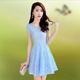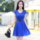 晨蝶夏季新款时尚短袖连衣裙女 优雅修身显瘦V领雪纺A字裙子蓝色