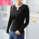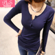 秋冬装修身纯色简约长袖开领V领女装T恤纯棉体恤打底衫钮扣大码