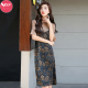 黑色碎花网纱罩衫连衣裙子夏2017新款修身气质淑女高腰雪纺假两件