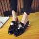2016秋季新款真皮粗跟中跟圆头单鞋英伦风黑色漆皮小辣椒链条女鞋