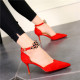 欧美性感水钻尖头细跟单鞋宴会鞋绒面红色婚鞋中空一字扣高跟鞋女