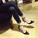 2017春欧美新款尖头高跟鞋细跟浅口一字扣带女鞋绒面脚环绑带单鞋