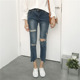 [言莎]韩国订单 韩版2017磨白直筒破洞撕边不规则牛仔九分裤女裤