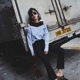 2017春装新款宽松假两件蓝白细竖条纹长袖露肩套头衬衫女装潮个性