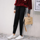 初夏新款 自制白边拼皮条纹九分休闲裤运动裤宽松显瘦小脚哈伦裤