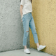 遇见春夏浅色纯棉牛仔阔腿裤女松紧腰宽松显瘦卷边九分牛仔休闲裤