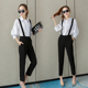 春装套装女时尚气质2017新款韩版女装衬衣上衣哈伦裤背带裤两件套