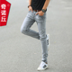 春季款男士韩版修身黑灰色破洞牛仔裤弹力显瘦小脚裤潮男装长裤子