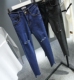 春季韩国深蓝色小脚裤高腰弹力紧身膝盖破洞铅笔裤九分裤牛仔裤女