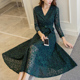 2017春装新款女装韩版V领名媛七分袖蕾丝连衣裙秋中长款A字裙子夏