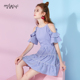 印花连衣裙夏装2017新款女韩版小清新条纹露肩裙子高腰a字裙短裙