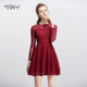 米莱伊2017春装新款女连衣裙欧洲站镂空显瘦长袖酒红色蕾丝裙子