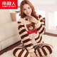 南极人秋冬季珊瑚绒睡衣女可爱卡通加大条纹大码法兰绒家居服套装