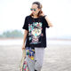 驿墅新款女大码短款下开叉卷边袖卡通印花圆领宽松女装T恤上衣