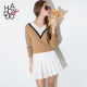 Haoduoyi甜美海军风撞色条纹拼接喇叭短裙 翻领灯笼袖收腰连衣裙