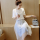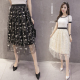 夏季新款刺绣T恤短袖连衣裙中长款高腰网纱百褶半身裙两件套装裙