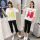 2017夏季数字印花短袖T恤织带七分裤两件套女时尚运动休闲套装潮